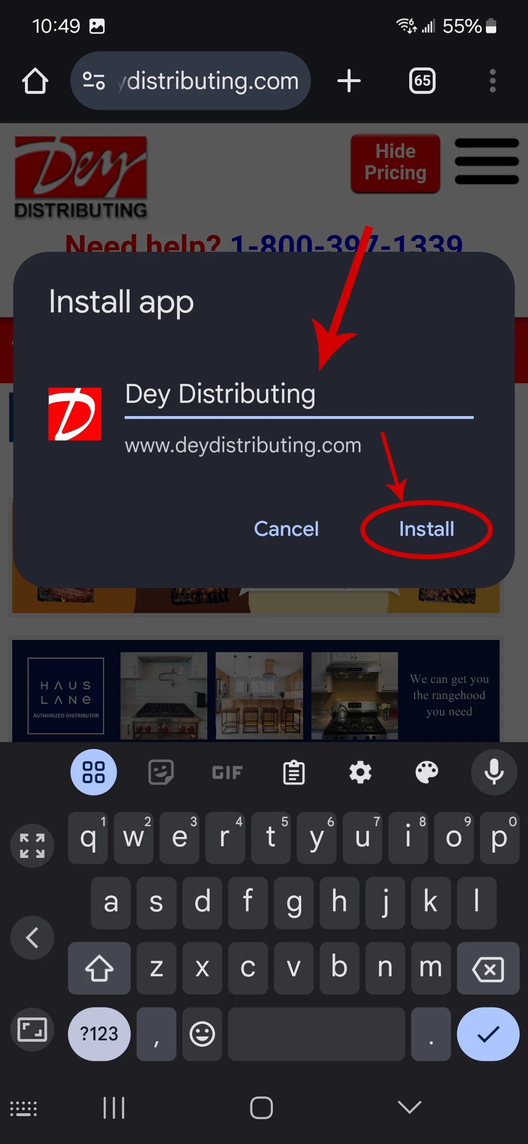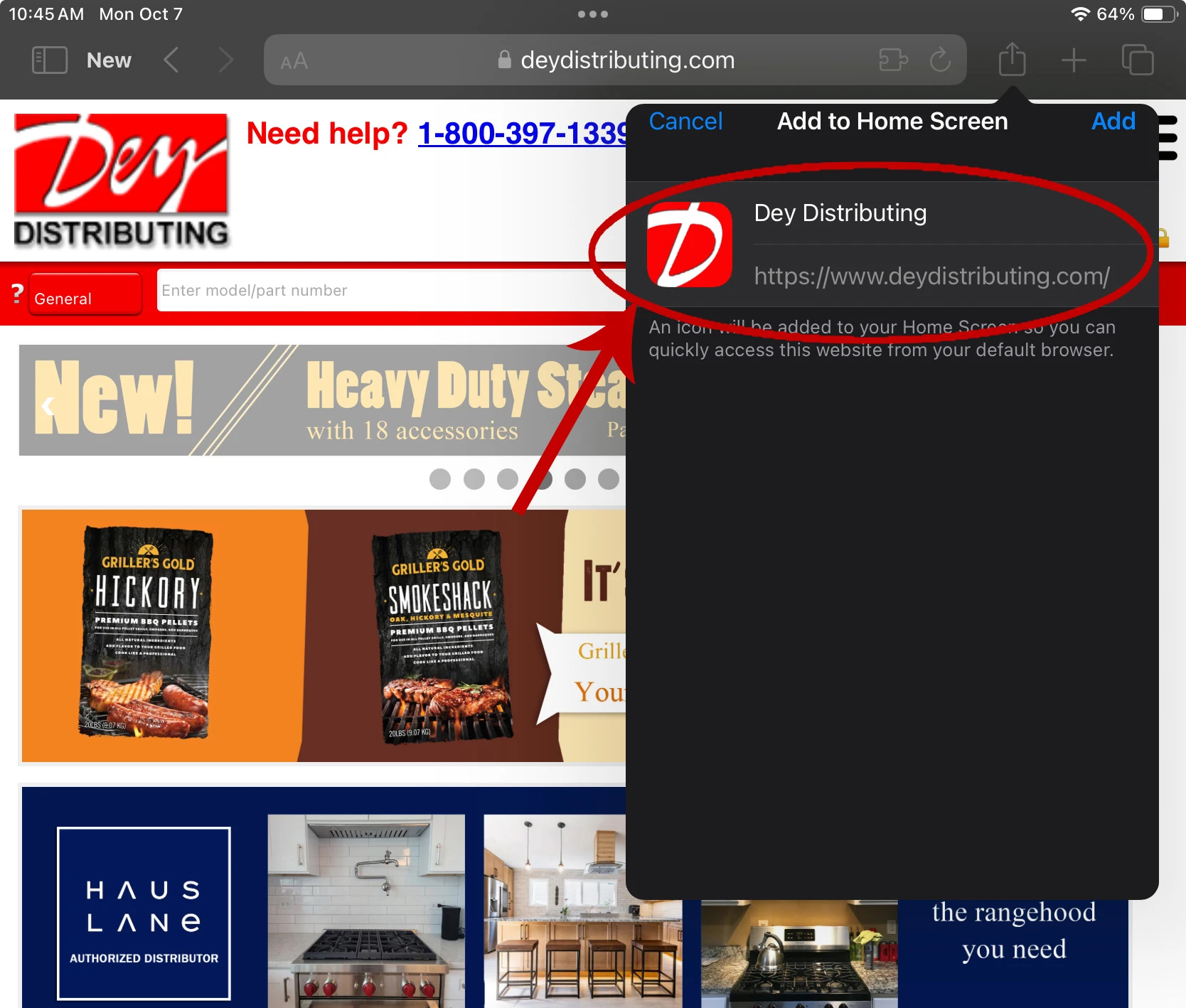 After selecting “Add to Home Screen”, name your icon (eg, Dey, or Dey Parts) and then choose "Install"